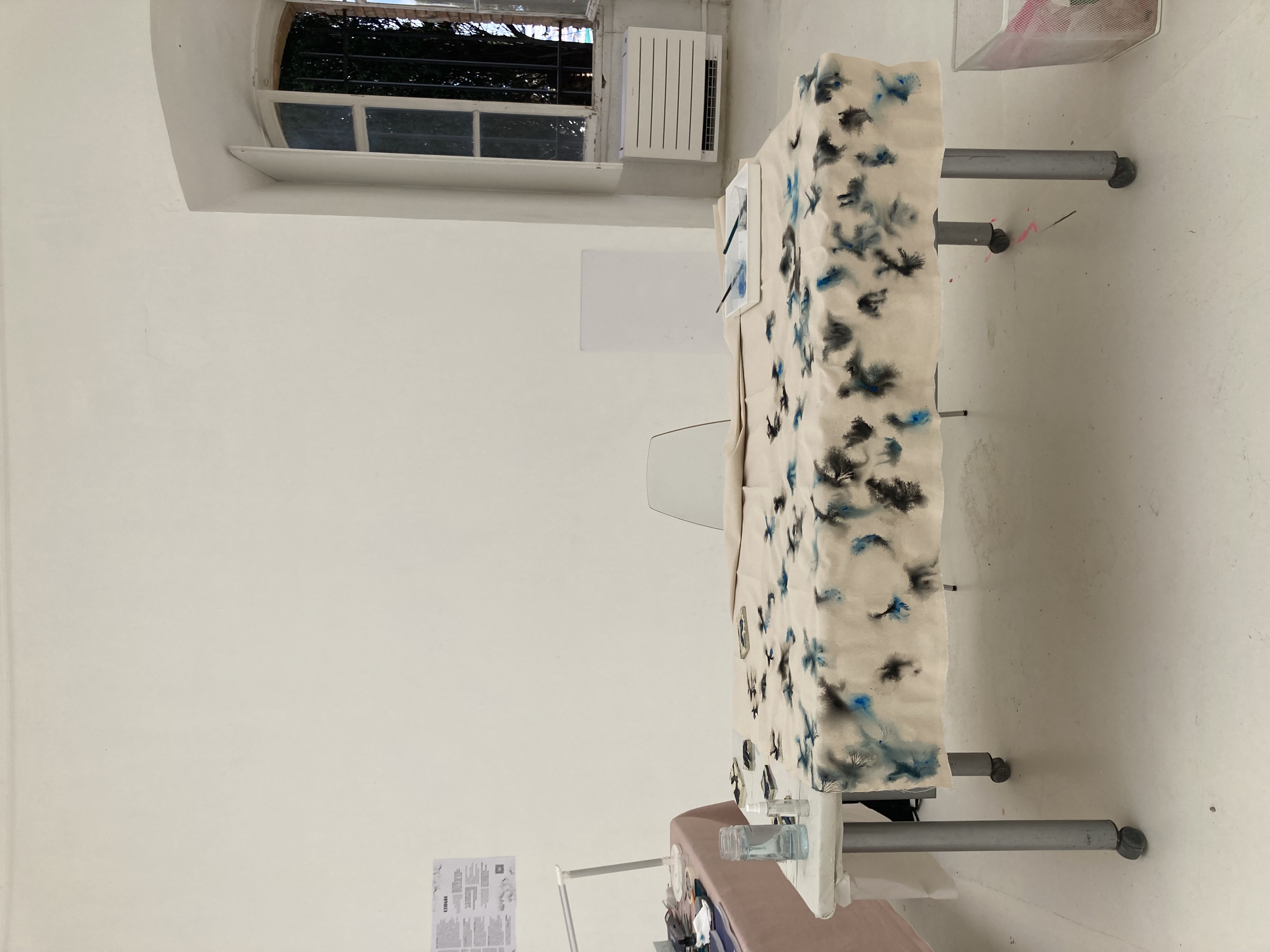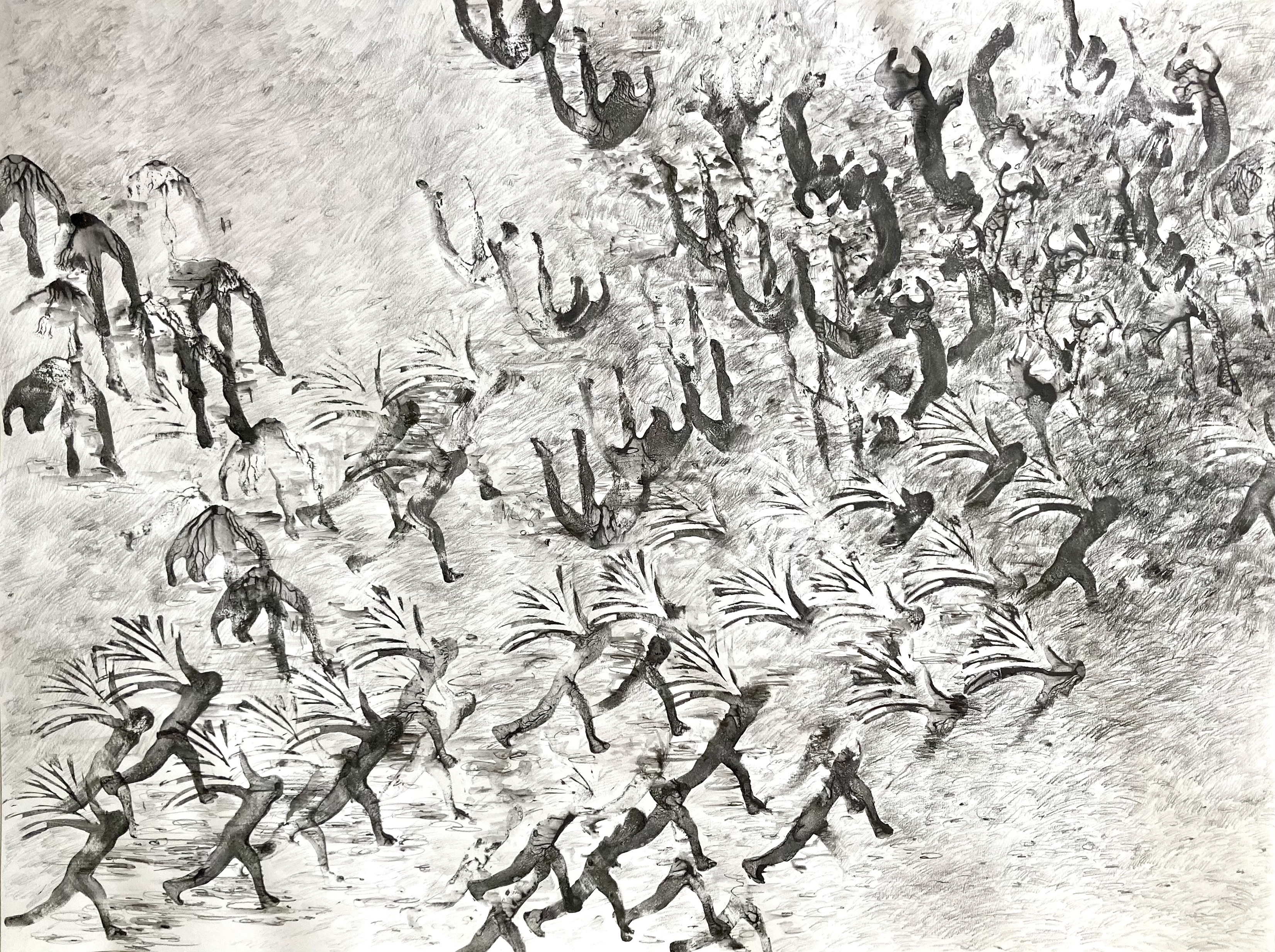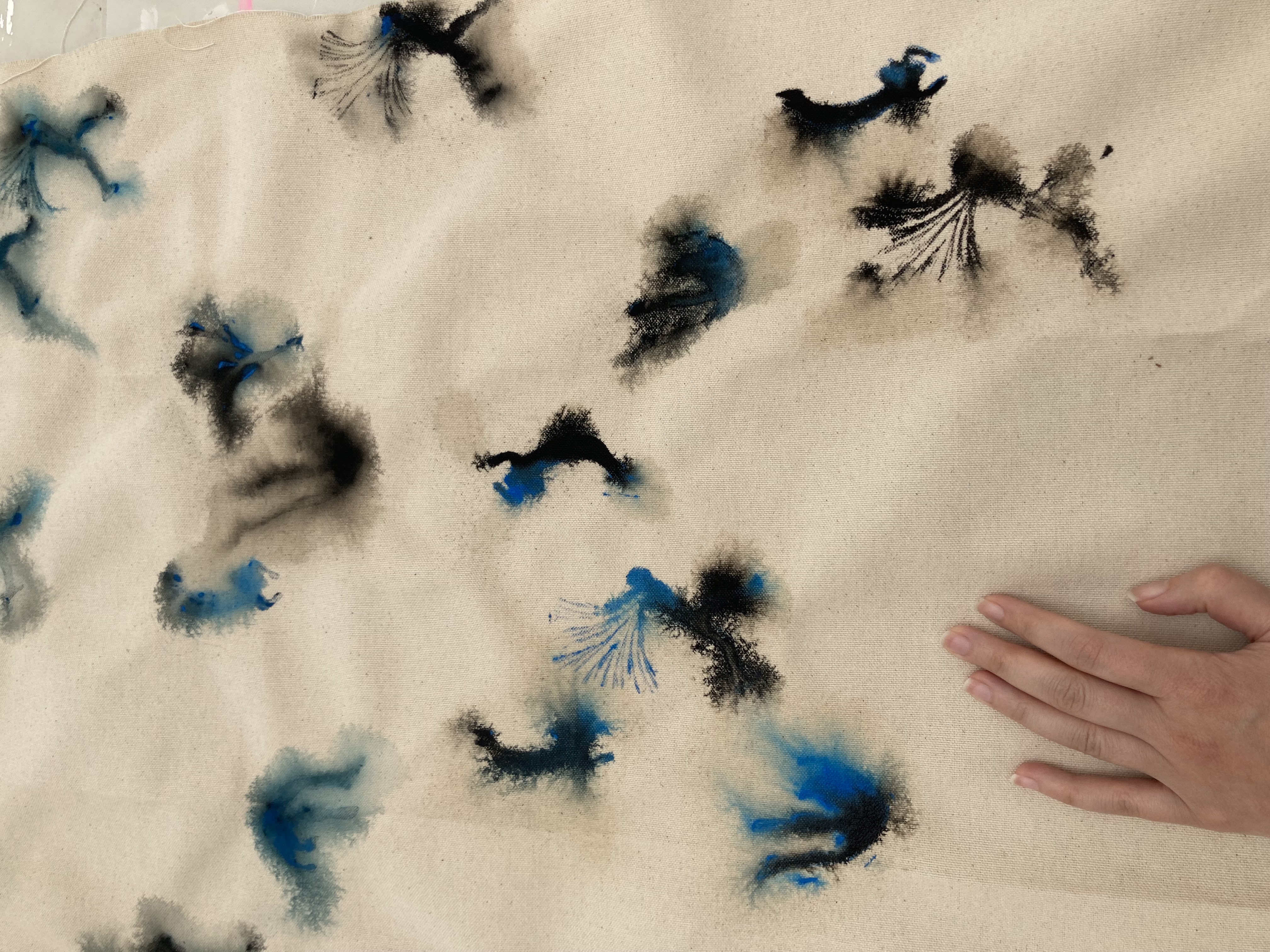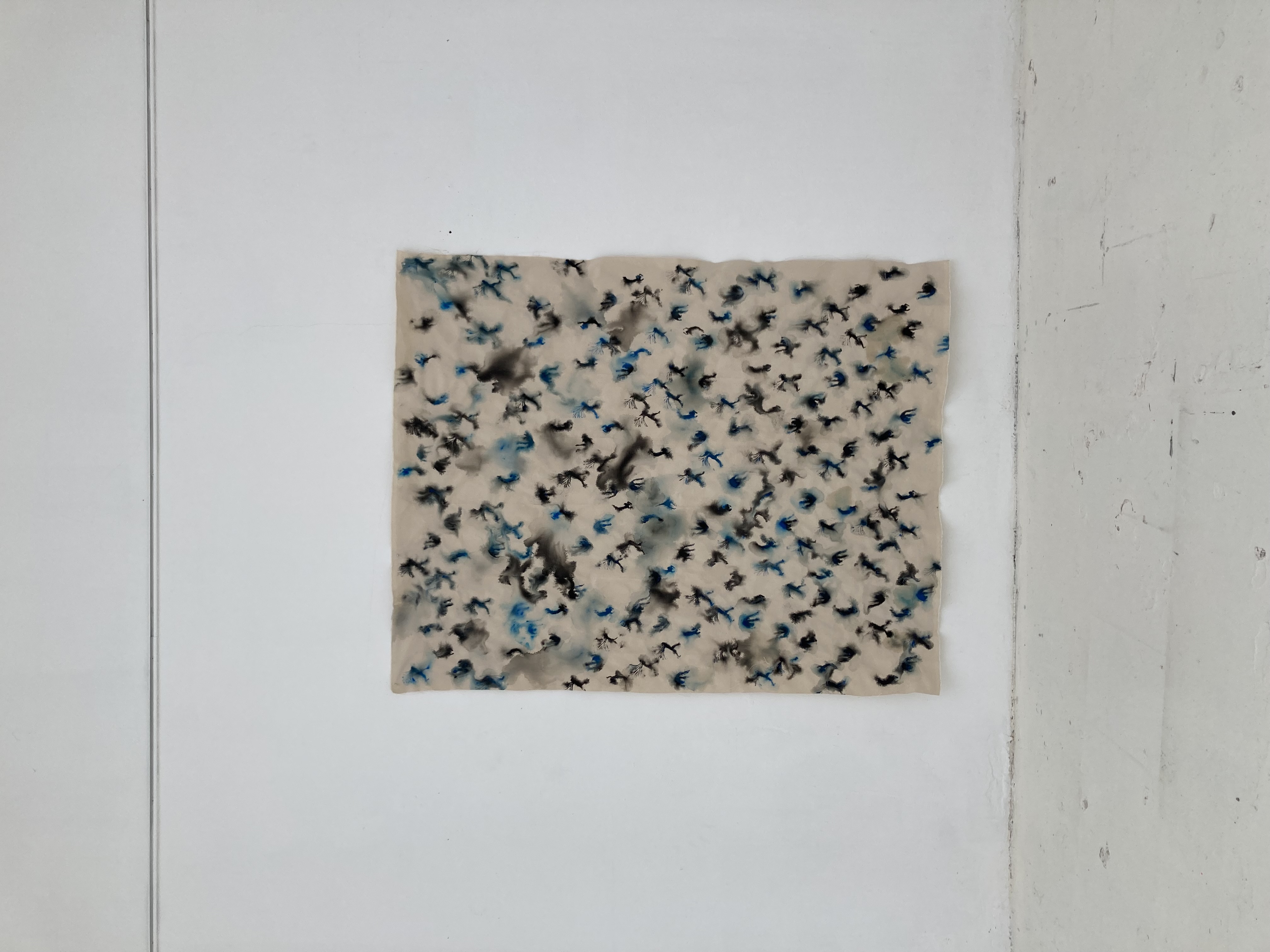 In a perspective of emancipation and resistance, we see videos of Iranian women on Instagram who, through song, dance and acrobatic movements in public spaces, lead their struggle for freedom and democracy in Iran. In this work, the movement of a woman doing a somersault in the street, represented by print stains, evokes the flight of birds, free between sky and earth, becoming bird-women.